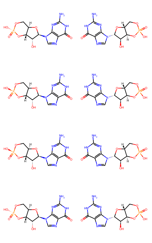 | 1363 | Nc1nc2c(ncn2[C@@H]2O[C@@H]3CO[P@](=O)(O)O[C@H]3[C@H]2O)c(=O)[nH]1 | P1(=O)(O[C@@H]2[C@H](O[C@@H](N3C=4N=C(NC(=O)C4N=C3)N)[C@@H]2O)CO1)O |