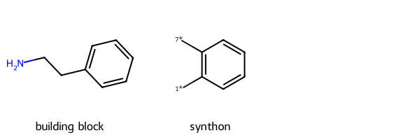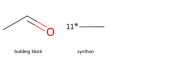 Draw.MolsToGridImage([r2,p[0][0]],legends=['building block','synthon'])[15:59:41] mapped atoms in the reactants were not mapped in the products.