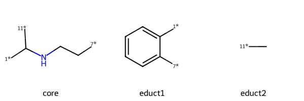Draw.MolsToGridImage([core,chains[0],chains[1]],legends=['core','educt1','educt2'])